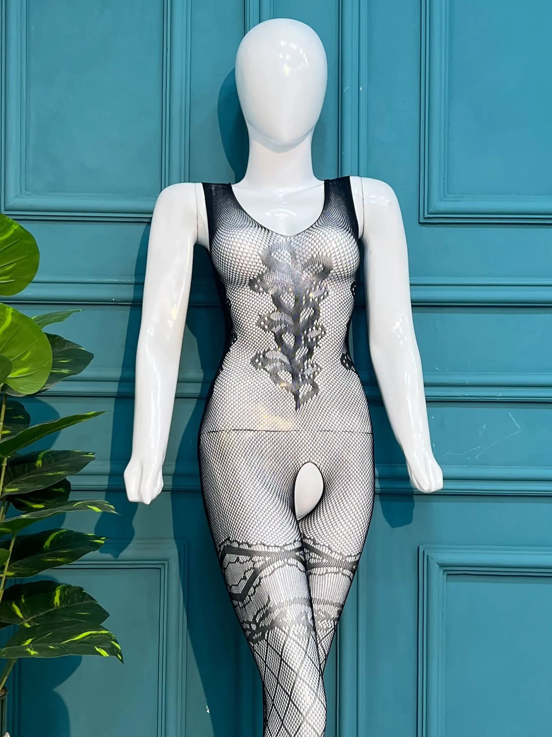 Elevate your intimate collection with this stunning, full-length bodystocking. Designed with a delicate floral lace motif and intricate diamond-grid mesh, this piece seamlessly blends bold sophistication with elegant artistry.