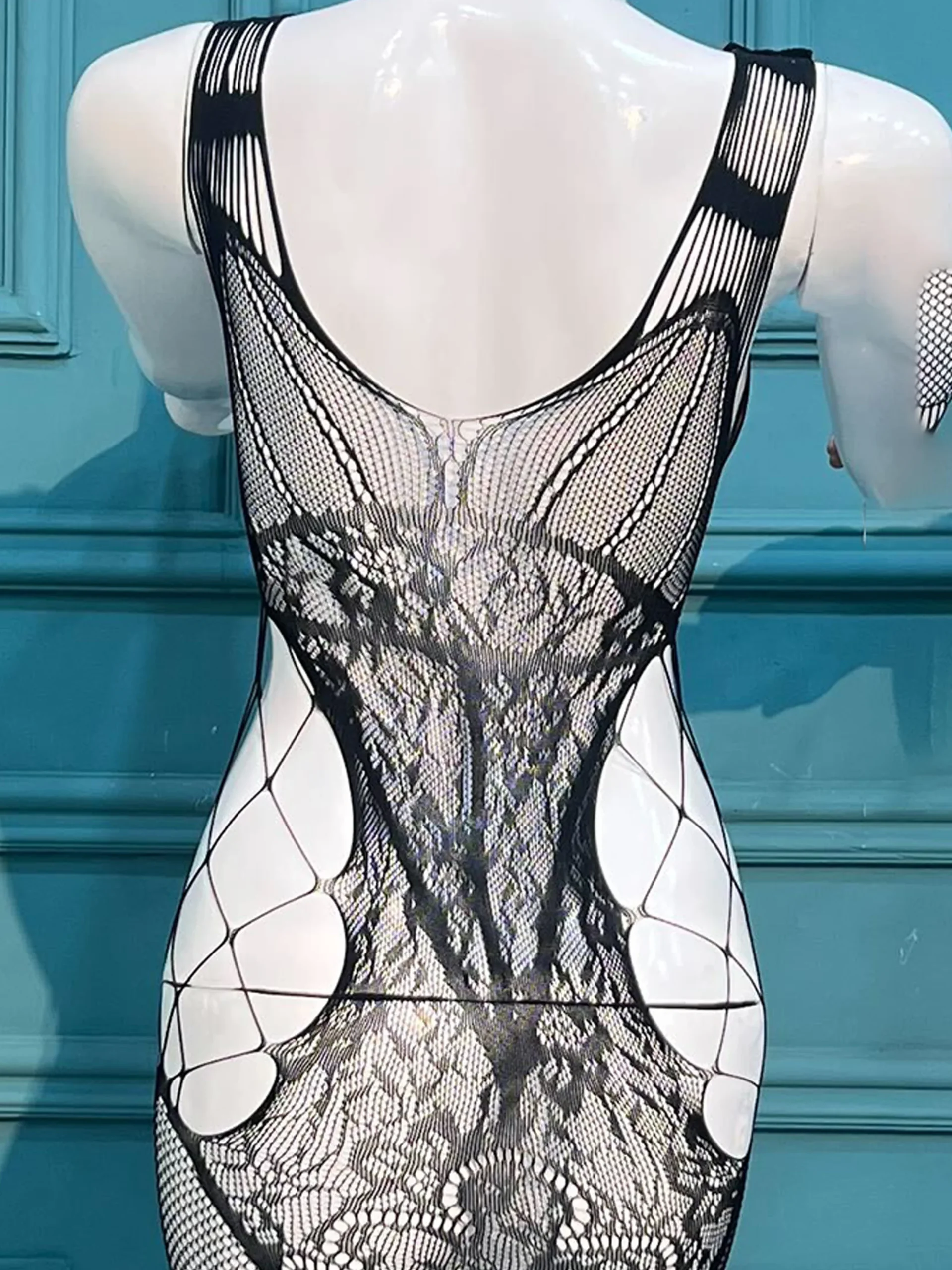 Crafted from premium, high-stretch mesh, it ensures a seamless, “second-skin” fit that moves with you. The unique open-crotch design and patterned leg detailing make it the perfect statement piece for a bold, high-fashion look.