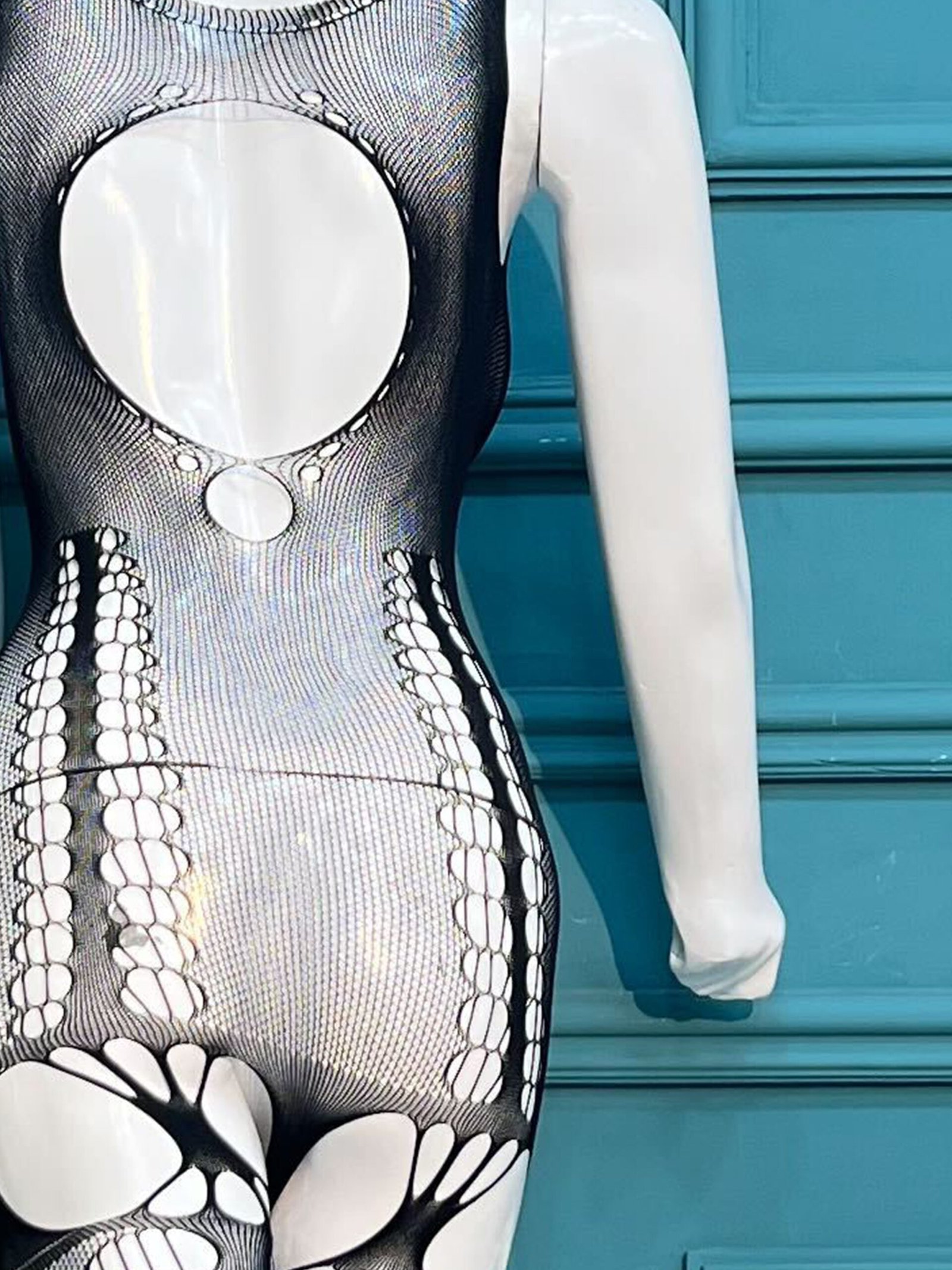 Make a bold statement with the Midnight Aura Bodystocking, a seamless blend of edgy design and sophisticated allure. Crafted from ultra-stretch, breathable mesh, this full-length piece features intricate circular cut-outs along the torso and thighs that create a striking, avant-garde silhouette.